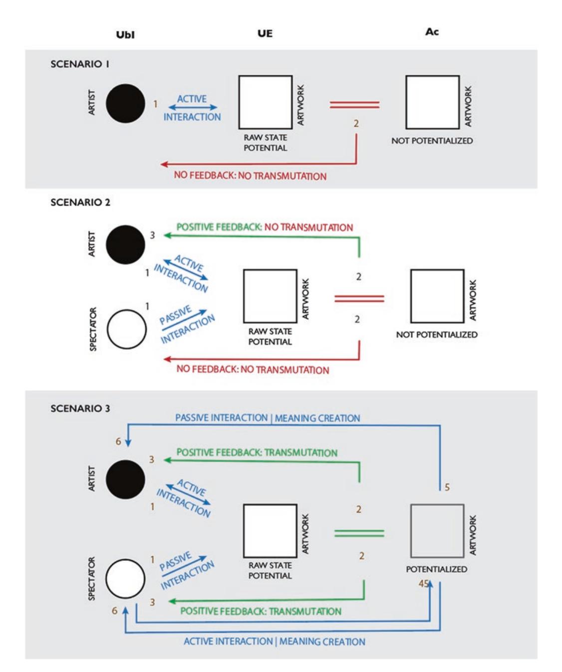 Fig. 10.2 Creative Act scenarios analyzed under columns: "unexpressed but intended" [UbI] concept, the "unintentionally expressed" [UE] and the "art coef!cient" [Ac] in the production of meaning. In Scenario I only the artist interacts with the artwork in raw state but without a spectator the work doesn't transmute or transubstantiate into Ac (new meaning.) In Scenario 2 both artist and spectator interact with the artwork in raw state but as the spectator doesn't engage with the artwork, it stays in raw state. The spectator's feedback to the artist reveals that the artwork doesn't promote the Ac. Scenario 3 represents the ideal Ac, where artist and spectator interact through the artwork and transmute and transubstantiate the work into Ac, and both experience new meaning
