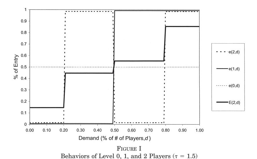Figure I shows the predicted entry functions for CH players using 0, 1, and 2 levels of reasoning (e(0,d), e(1,d), e(2,d)) and the interim cumulative entry function (E(2,d)), for $\tau=1.5$ . Note how the entry function e(2,d) of the 2-step type "smoothes" the cumulative entry function E(2,d). The 2-step thinkers only enter when they think they can exploit the fact that too few lower-0-and 1-step thinkers entered (for $.5/(1+\tau) < d < .5$ and $(.5+\tau)/(1+\tau) < d < 1$ ), and stay out when they think too many 0-and 1-step types entered (for $0 < d < .5/(1+\tau)$ and $.5 < d < (.5+\tau)/(1+\tau)$ ).