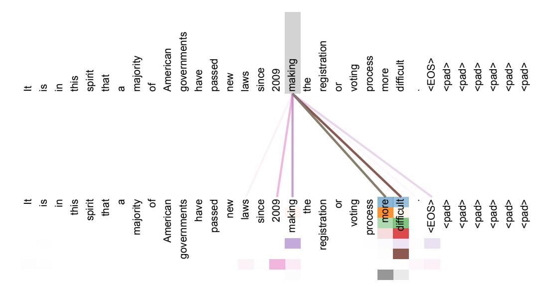 Figure 3: An example of the attention mechanism following long-distance dependencies in the encoder self-attention in layer 5 of 6. Many of the attention heads attend to a distant dependency of the verb 'making', completing the phrase 'making...more difficult'. Attentions here shown only for the word 'making'. Different colors represent different heads. Best viewed in color.