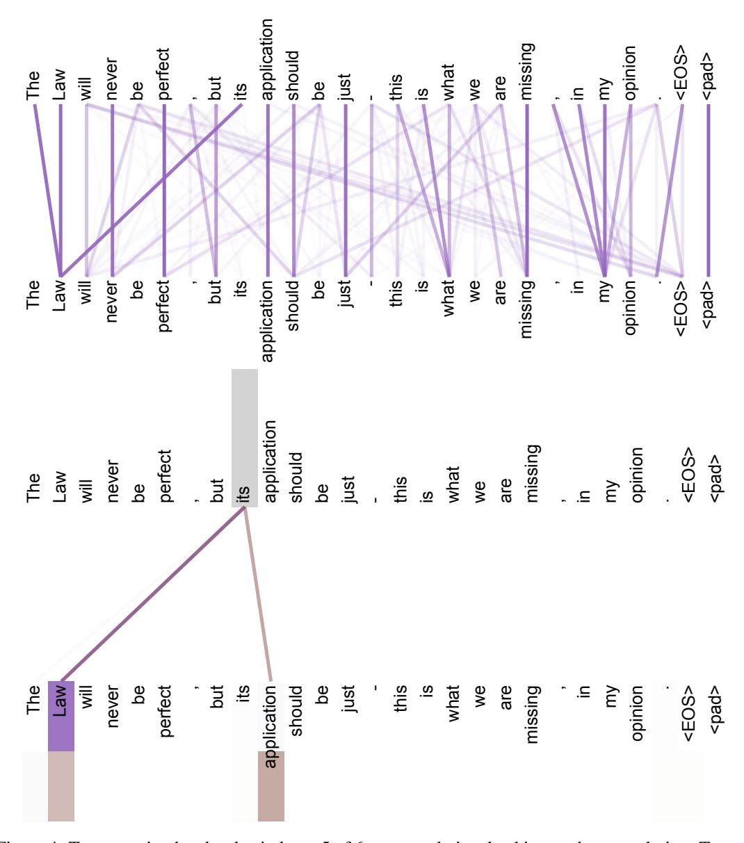 Figure 4: Two attention heads, also in layer 5 of 6, apparently involved in anaphora resolution. Top: Full attentions for head 5. Bottom: Isolated attentions from just the word 'its' for attention heads 5 and 6. Note that the attentions are very sharp for this word.