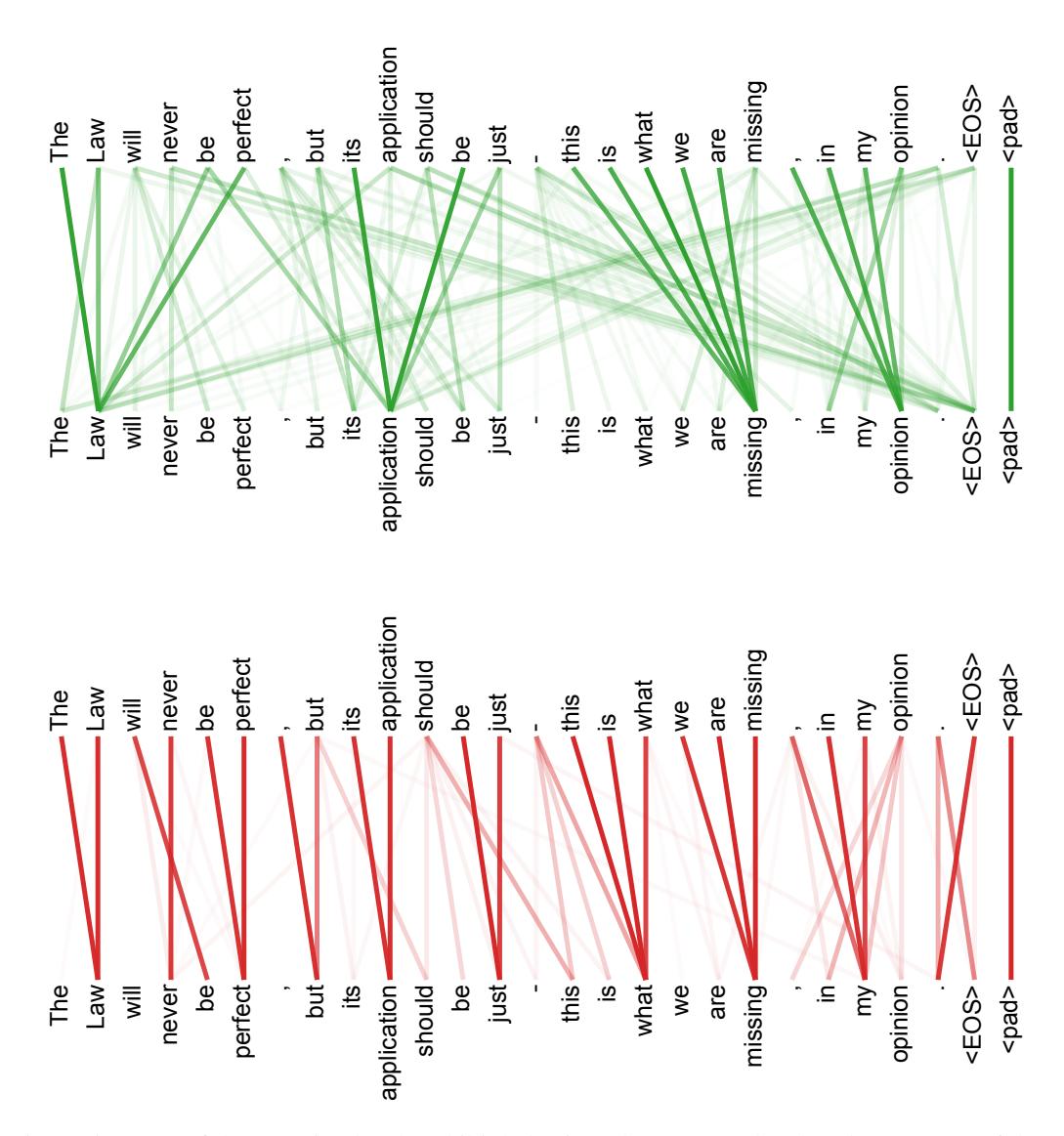 Figure 5: Many of the attention heads exhibit behaviour that seems related to the structure of the sentence. We give two such examples above, from two different heads from the encoder self-attention at layer 5 of 6. The heads clearly learned to perform different tasks.