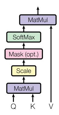 Attention $$(Q, K, V) = \operatorname{softmax}(\frac{QK^T}{\sqrt{d_k}})V$$ (1)