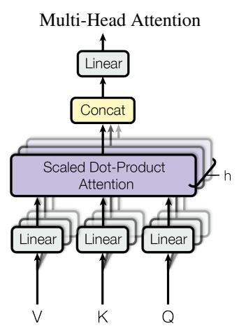 $$\begin{aligned} \text{MultiHead}(Q, K, V) &= \text{Concat}(\text{head}_1, ..., \text{head}_h) W^O \ \text{where head}_i &= \text{Attention}(QW_i^Q, KW_i^K, VW_i^V) \end{aligned}$$