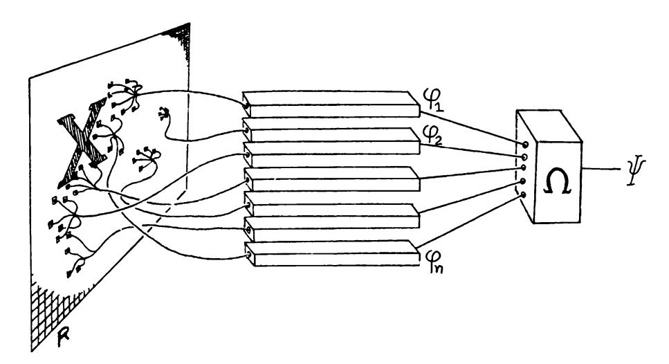 There are a number of problems concerning the possibility of infinite sums and such matters when we apply this concept to recognizing patterns in the Euclidean plane. These issues are discussed extensively in the text, and we want here only to reassure the mathematician that the problem will be faced. Except when there is a good technical reason to use infinite sums (and this is sometimes the case) we will make the problem finite by two general methods. One is to treat the retina R as made up of discrete little squares (instead of points) and treat as equivalent figures that intersect the same squares. The other is to consider only bounded A''s and choose so that for any bounded X only a finite number of will be nonzero.