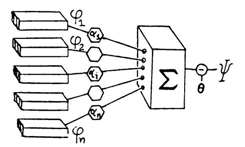 From this point on, we will concentrate our attention on a particular scheme for Stage II—"weighted voting," or "linear combination" of the predicates of Stage I. This is the so-called perceptron scheme, and we proceed next to give our final definition.