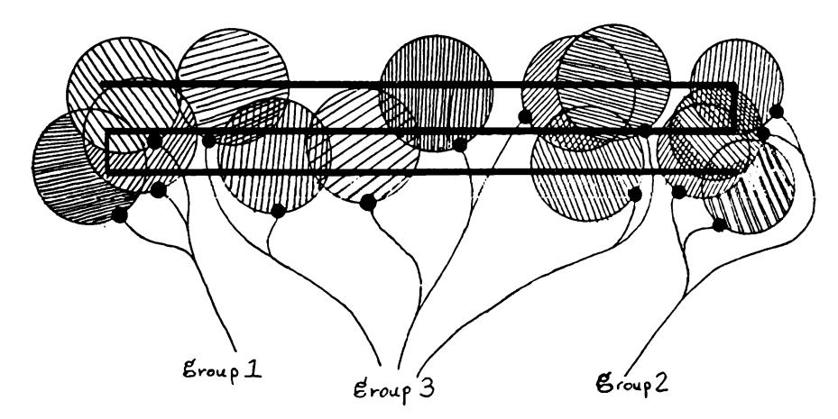 and a diameter-limited perceptron \p whose support sets have diameters like those indicated by the circles below: