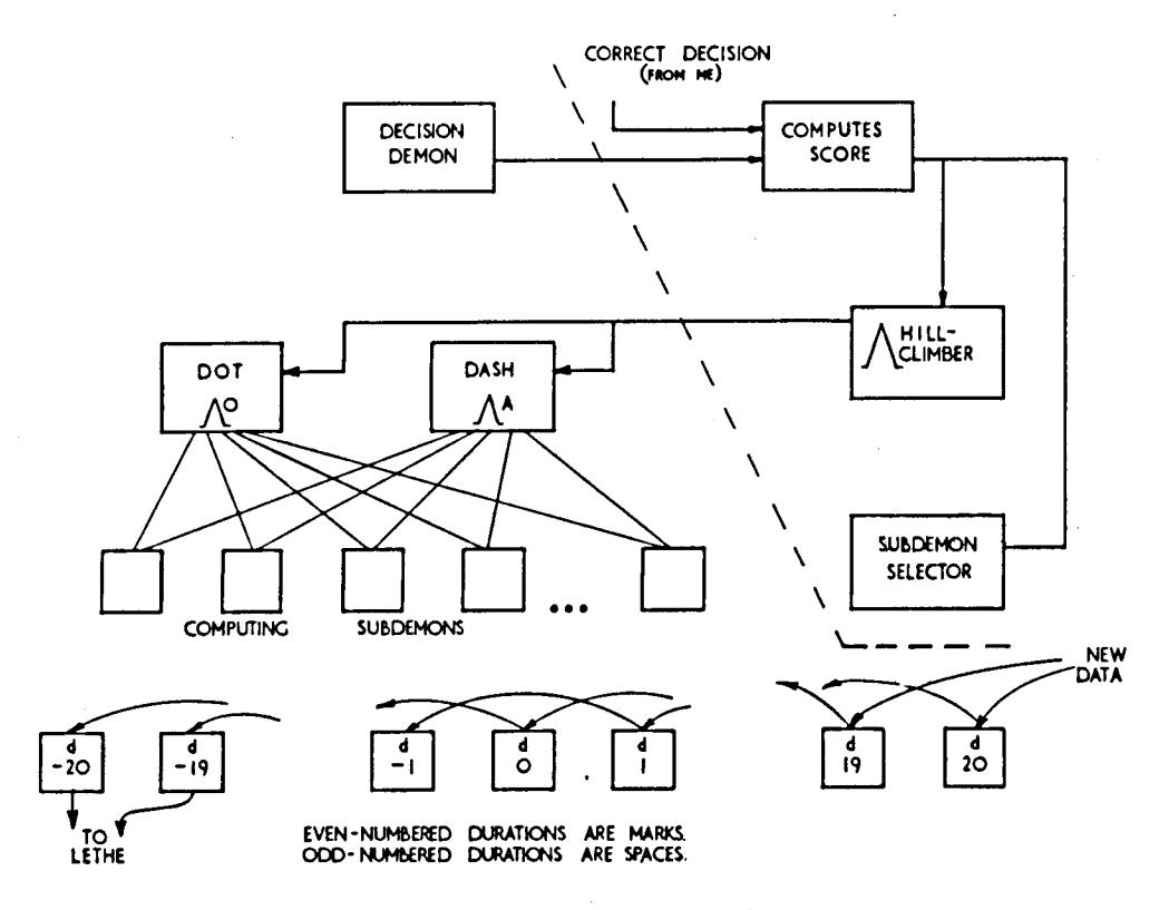 - (2) The cognitive demons, dot and dash, each compute a weighted sum of the outputs of some 150 computing subdemons. Initial weights we have assigned arbitrarily, but, we hope, reasonably.