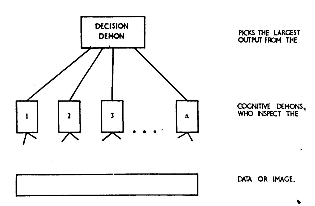We first construct an idealized pandemonium (fig./). Each possible pattern of the set, represented by ademon in abox, computes his similarity with the image simultaneously on view to all of them, and gives an output depending monotonically on that similarity. The decision demon on top makes a choice of that pattern belonging to the demon whose output was the largest.*