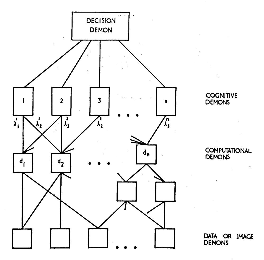 The difference between fig.1 and fig.3 is that the common parts of the computations that each cognitive demon carries out in fig./ have in fig.3 been assigned instead to a host of subdemons. At this stage the organization has four levels. At the bottom the data demons serve merely to store and pass on the data. At the next level the computational demons or subdemons perform certain more or less complicated computations on the data and pass the results of these up to the next level, the cognitive demons who weigh the evidence, as it were. Each cognitive demon computes a shriek, and from all the shrieks the highest level demOn 'of all, the decision demon, merely selects the loudest.