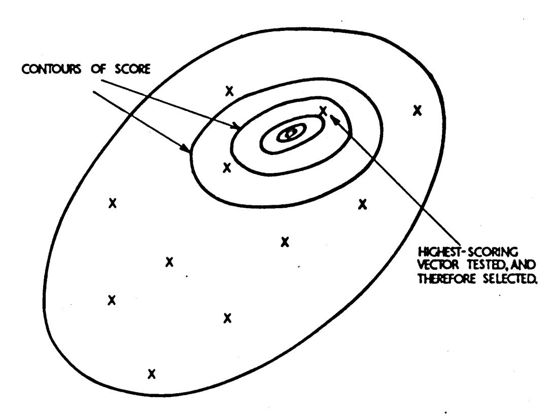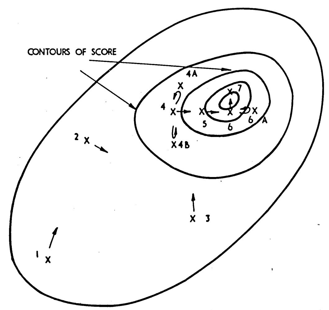 Fig.5. Second hill—climbing technique: pick vectors until one of them (Number 4) outscores the previous ones. Then take short randOM steps, retracing any that decrease the score.