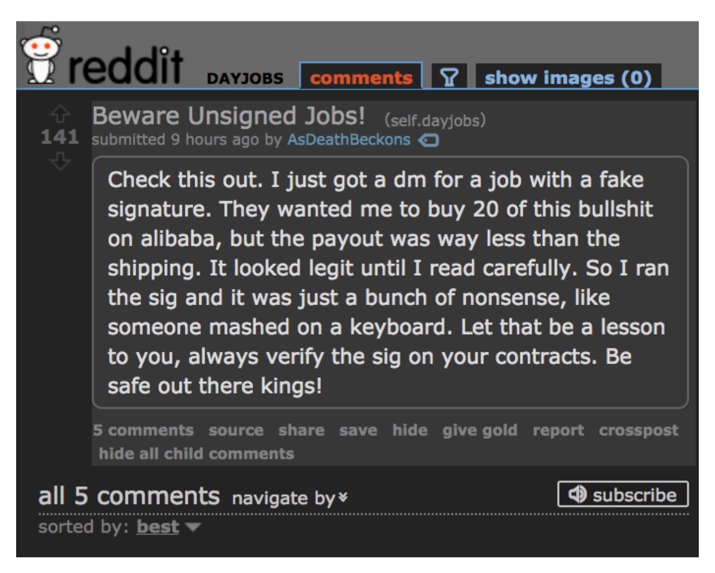 The vast majority of dayjobs are cryptographically signed by just three entities. If you get a job without a sig, it's a guaranteed fraud. As the post above attests, many people will even try to spoof their way past the verification step. The world is full of bad actors, so it's important to keep your wits.