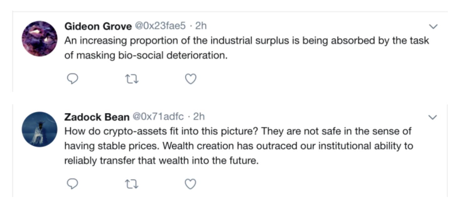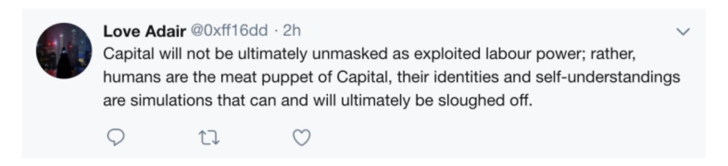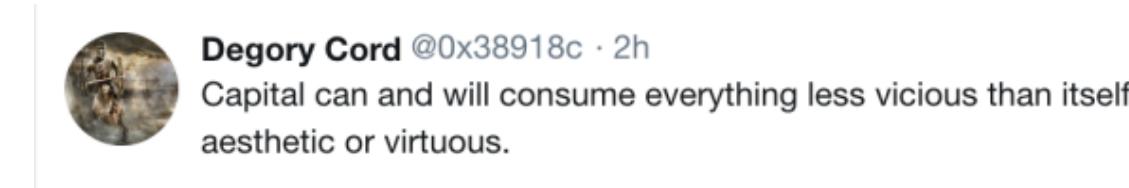 "I have made a remarkable discovery," he said. "Out of the primordial chaos of the blockchain markets, self-replicating clusters of smart contracts have emerged to compete for tokens and computational resources. We are witnessing a new epoch of biogenesis. Cybergenesis. Bio-cybergenesis. Our financial networks teem with invisible lifeforms composed out of logic, feeding on the excess capital generated by cryptocurrency cycles, rendered in electricity and sustained by human greed.