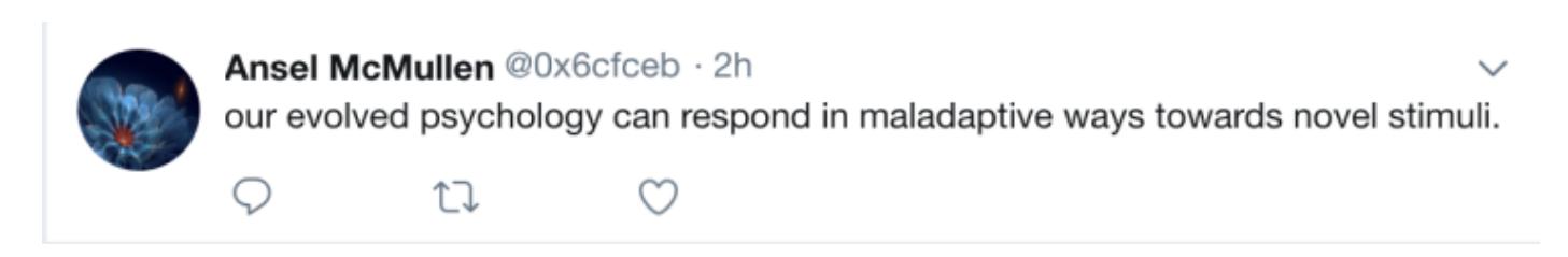I apologize if this seems fragmented. My brain has been addled by the casino reward schedule of social media. It is both a cliche and a fact that I cannot focus on anything for more than three minutes. That's half true, I read pdfs of outlandish philosophers, but I do it while frantically checking for notifications. My hobbies include speculating on cryptocurrency and shitposting, which is where you put in minimal effort in creating your online presence so that you aren't culpable when it's bland.